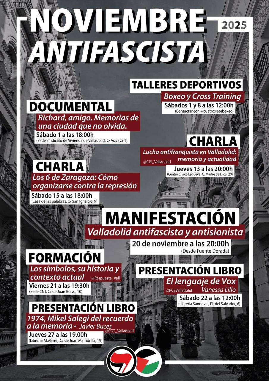 Porque la ciudad no es de la reacción ni de los agresores ultras patrocinados por el Real Valladolid, porque el 20N siempre será Antifascista y Antisionista desde la Coordinadora Antifascista de Valladolid se han organizado las siguientes actividades: