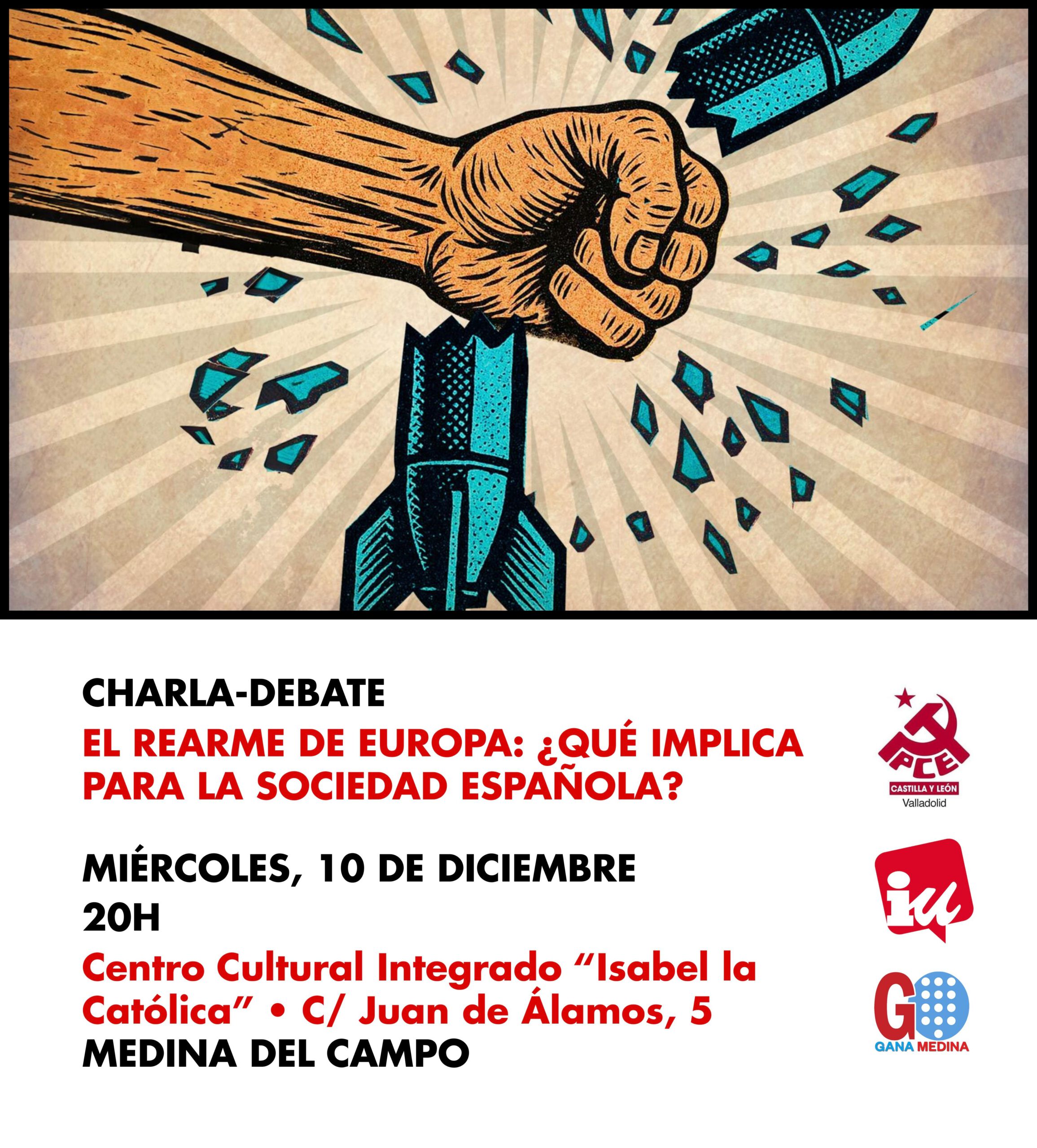 Medina del Campo, 6 de diciembre de 2025 – El Partido Comunista de España (PCE) en Medina del Campo, junto a Izquierda Unida y Gana Medina, invitan a todos los ciudadanos y ciudadanas a la charla-coloquio titulada «El rearme en Europa, ¿Qué implica para la sociedad española?». El acto tendrá lugar el próximo miércoles, 10 de diciembre de 2025, a las 20 horas en el Centro Cultura Integrado “Isabel la Católica” (Calle Juan de Álamos 5).