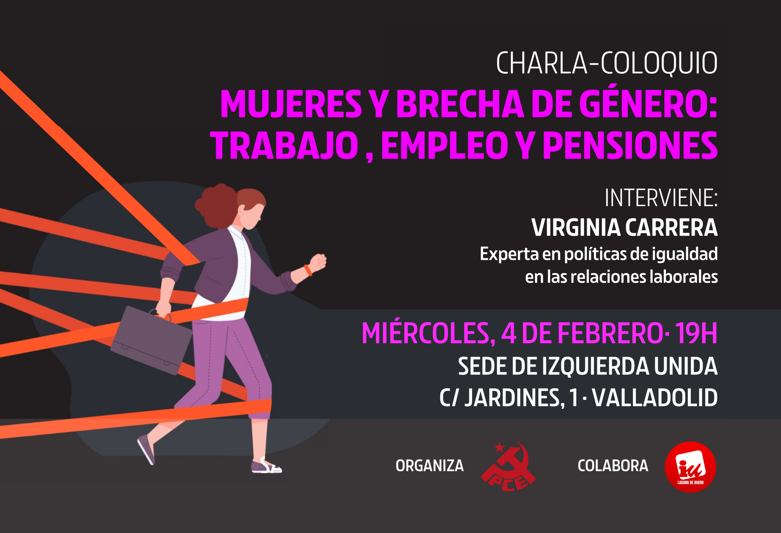 Pues el próximo miércoles 4 de febrero en Valladolid a las 19h en la sede de Izquierda Unida Valladolid (Calle Jardines 1) desde el PCE de Valladolid organizamos, junto a IU, la charla «Pensiones, mujeres y brecha salarial» para explicarte qué es y para ello contaremos con Virginia Carrera, experta en perspectiva de género en las relaciones laborales, ex-concejala de IU en la ciudad de Salamanca y que ha ejercido como técnica de igualdad en el sindicato CCOO.